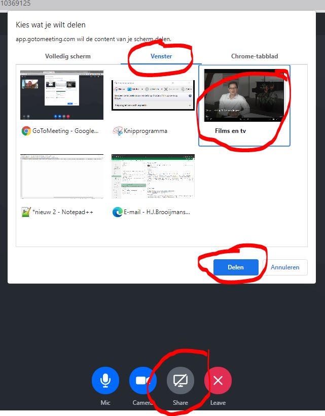 Als de meeting er klaar voor is: klik op de ronde Share/Scherm-button onderin beeld, kies "Venster" en klik dan op de player met de video. Vervolgens, klik op de Delen-knop.